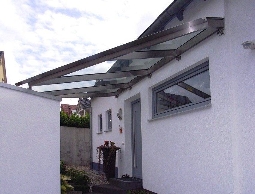 Стеклянные навесы встречаются крайне редко, но при желании мастер может попробовать соорудить козырёк над дверью своими руками. Этот материал прекрасно смотрится, если жилище построено в стиле минимализма. В противном случае от затеи лучше отказаться. Если в семье растут маленькие дети, во время активной игры мячом конструкция может быть сильно повреждена.