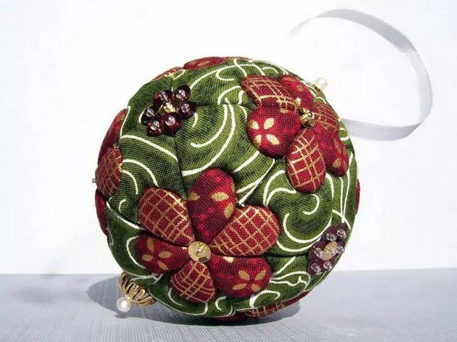 Очень здорово смотрится шарик с пайетками. Можно купить мелкие и обклеить посыпая шар, на который нанесен клей. Можно прикреплять рельефные пайетки по кругу, но это будет долго, этот способ быстрее и проще.