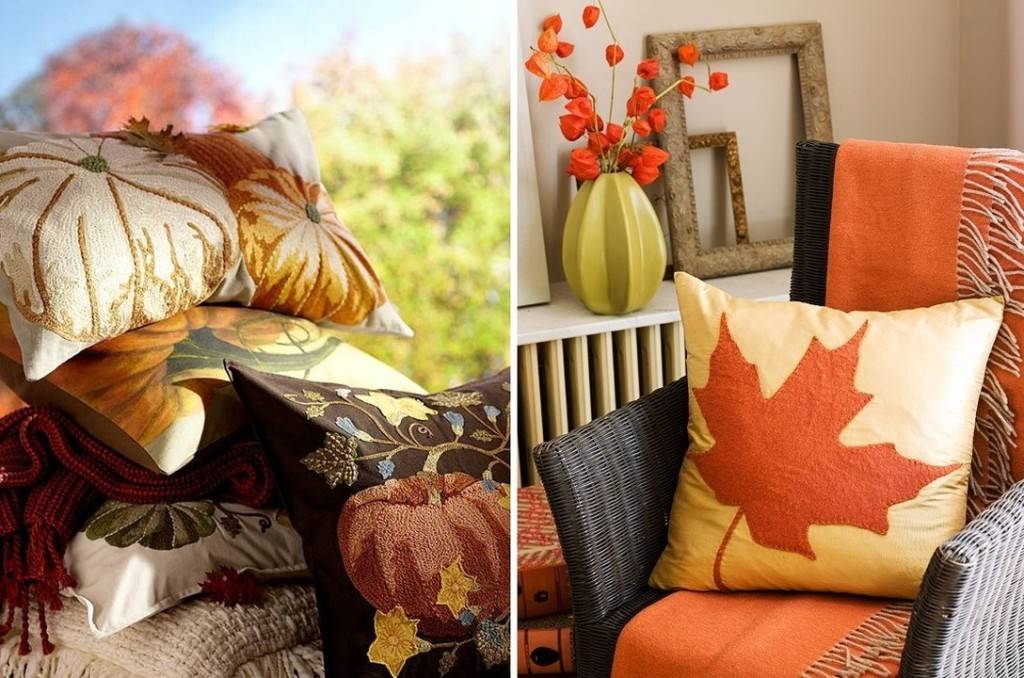 Основным аспектом формирования сезонного декора в традиционной обстановке считаются текстильные композиции. Чтобы в убранство комнаты не просочились нотки скуки, тоски или тусклости, интерьер декорируют цветными пледами, яркими накидками и декоративными подушками с сезонным орнаментом. Допустимы все яркие осенние цвета в соответствующих комбинациях.