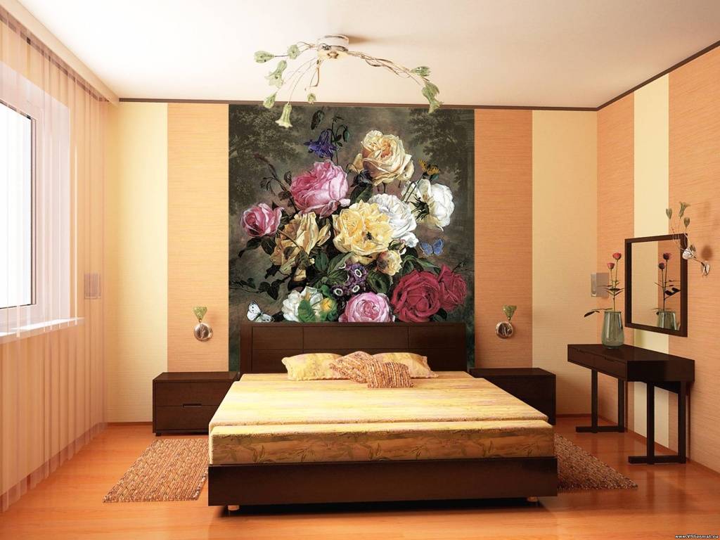 Чаще всего покраска обоев спальни осуществляется только в одном цвете (например, розовом, бежевом или голубом), но возможны и гармоничные комбинации. К примеру, синий, красный или коричневый цвет можно использовать для покраски стены, расположенной за кроватью.