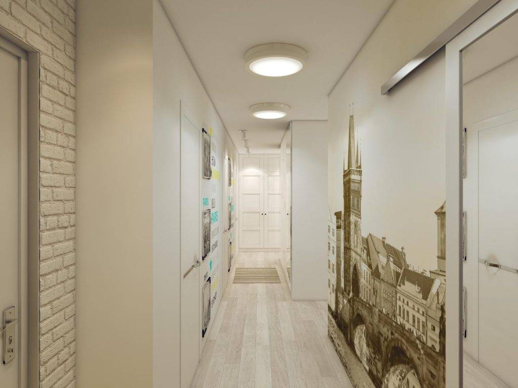 Для длинных и узких пространств используют трехмерные изображения водопадов, городских улиц или бескрайних полей. Освещение необходимо использовать точечное, настенное, желательны геометрические рисунки, расположенные поперек длины коридора.