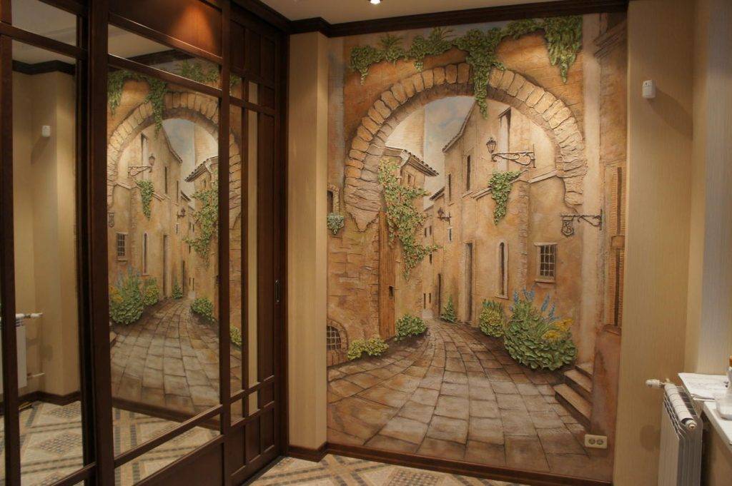 Крупные изображения фотообоев можно комбинировать с другими видами обойных покрытий. Насыщенные изображения хорошо сочетаются с жидкими обоями, внешне они смотрятся как штукатурка. Варианты оформления стен маленького коридора обоями с фото изображениями можно видеть на фото далее.