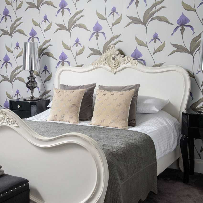 Фиолетовые оттенки очень мягкие и прекрасно подходят для оформления спален. Дополнить интерьер могут розовые, зеленые, бежевые, белые, кремовые и желтые элементы.