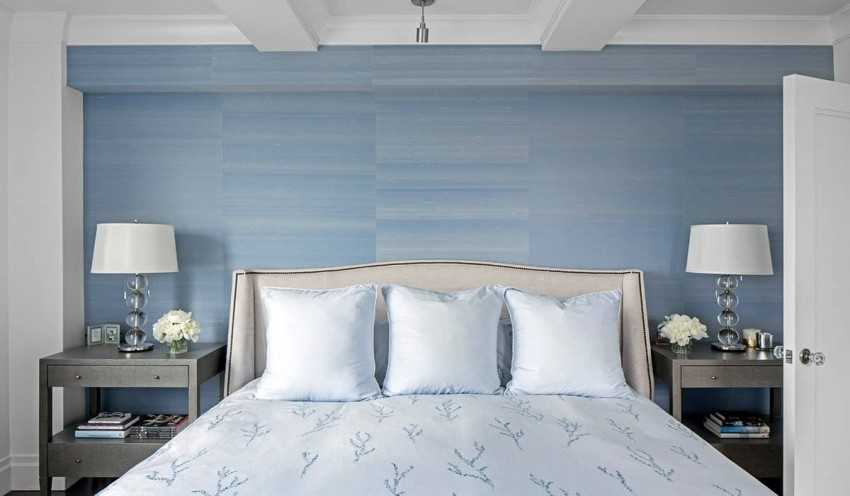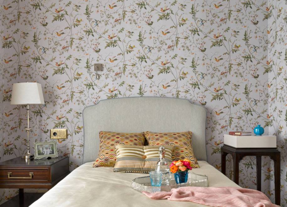 Дизайн часто оформляют при помощи комбинированных обоев для спальни двух видов, как на фото ниже. Конечно, самым распространенным вариантом является компоновка однотонных и принтованных обоев. При этом однотонный вариант отделки может по цвету перекликаться с одним из оттенков рисунка. Но также часто используются однотонные рулоны любого нейтрального цвета: белого, серого, бежевого.