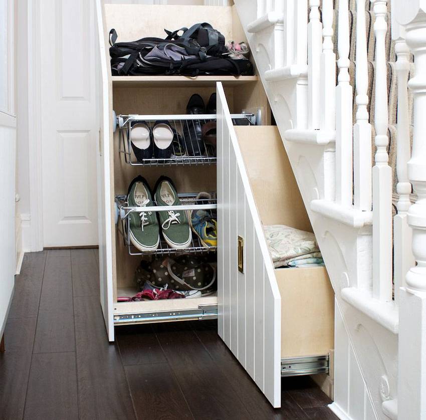 Если в доме или квартире есть лестница, то обувницу можно разместить под ступеньками