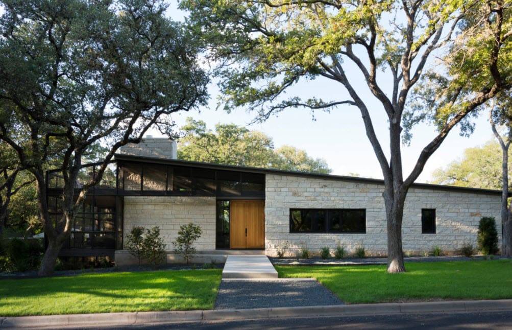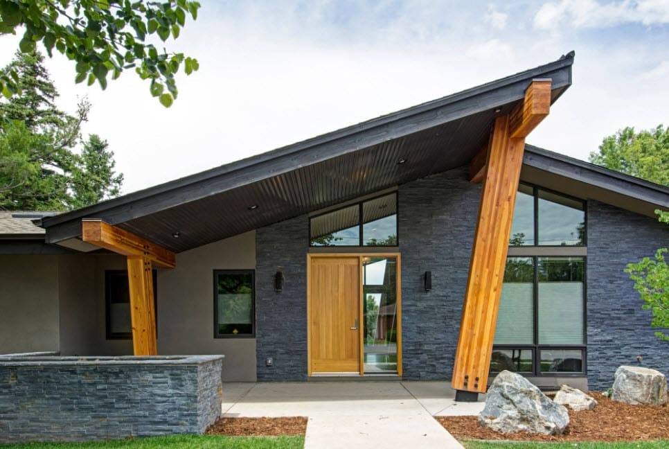 Крыльцо дома может разместиться как под длинным свесом односкатной крыши, так и под отдельным скатом в более низком уровне.