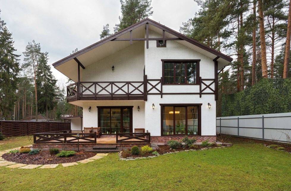 Каркасный деревянный домик с мансардой и односкатной кровлей — практичная конструкция для летней дачи за городом.