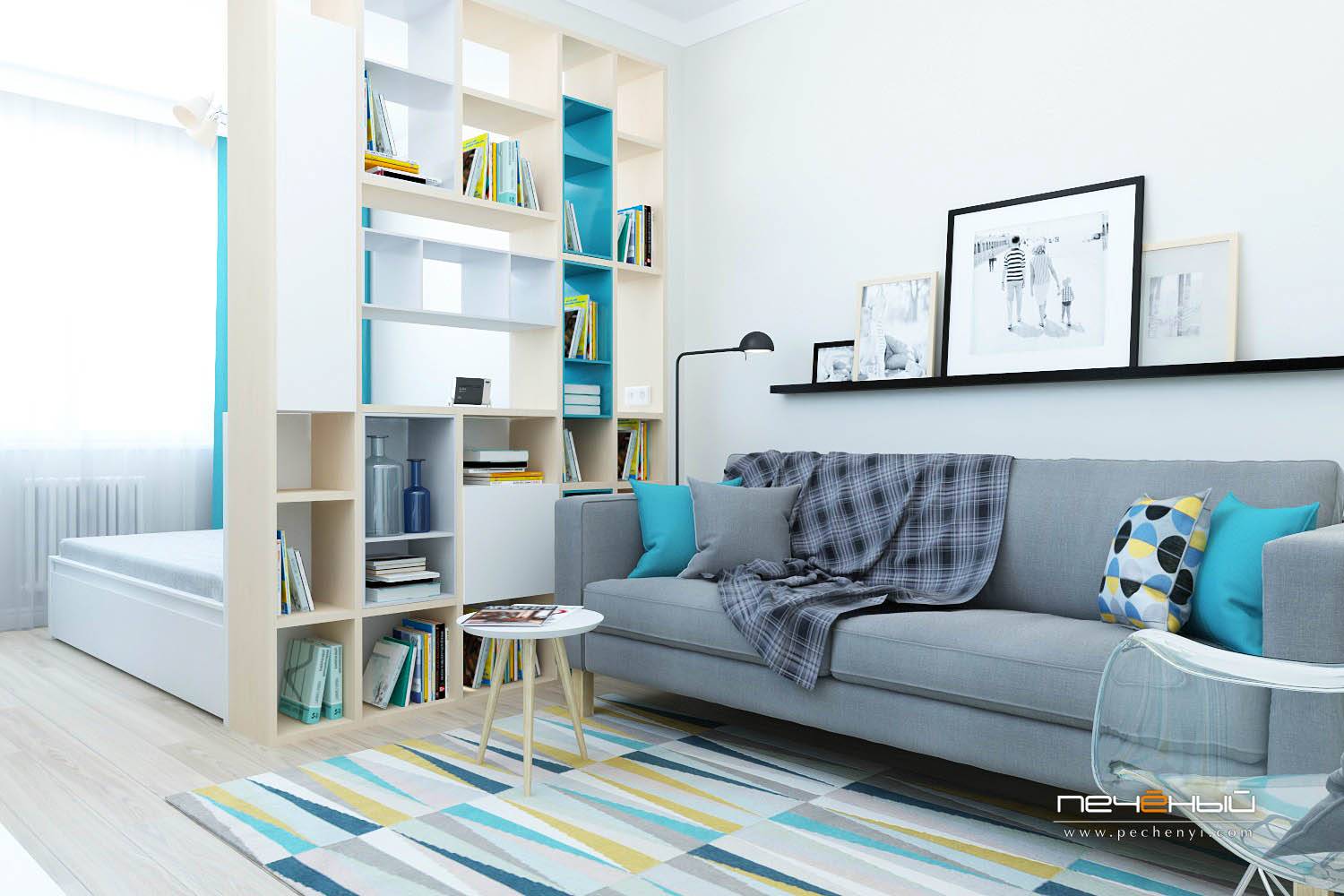В малогабаритных квартирах часто гостиная используется в качестве спальни. Вот один из приёмов, когда комнату можно зонировать с помощью большого стеллажа. Красиво и функционально.
