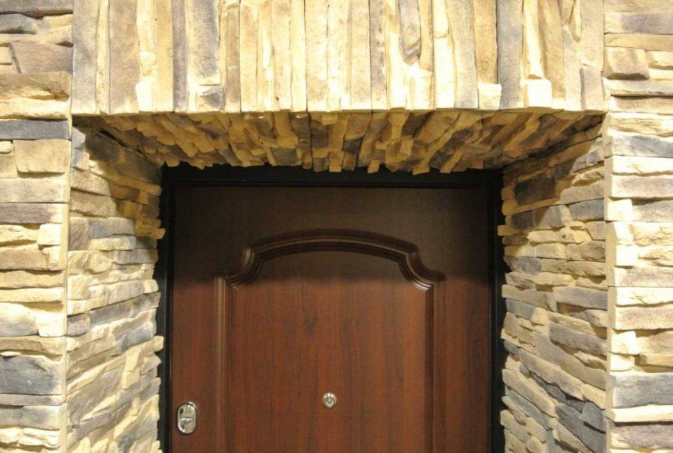 Если есть необходимость привлечь к дверному проему внимание, искусственный камень оформляют в виде неровной старинной кладки, «разрушенной» временем Для усиления сцепления на стене и откосах лучше сделать небольшие насечки. Далее поверхность обрабатывается грунтовочным составом Плитку вначале нужно разложить на полу, чтобы подобрать рисунок по выбранной схеме. Чтобы швы проходили по одной линии, следует заранее прочертить место их расположения, и лишь затем начинать укладывать «камни» Крепление панели начинают с углов