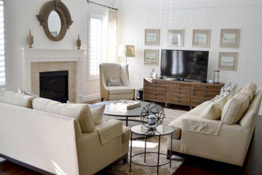 Главное, чтобы между мебельными изделиями и стенами оставалось много места для прохода и визуального ощущения простора. Светлая отделка гостиной в частном доме отчасти этому визуальному простору способствует.