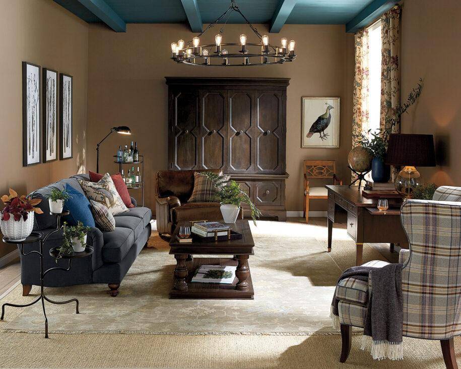 Стены гостиной можно выложить кирпичом либо оклеить соответствующими по рисунку обоями. Потолок и полы рекомендуется застелить досками либо однотонной плитой. На окнах следует размещать жалюзи. Цветовое решение комнаты может быть самым разнообразным, но чаще всего выбирают: