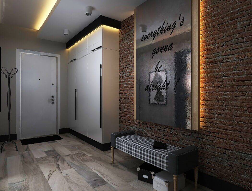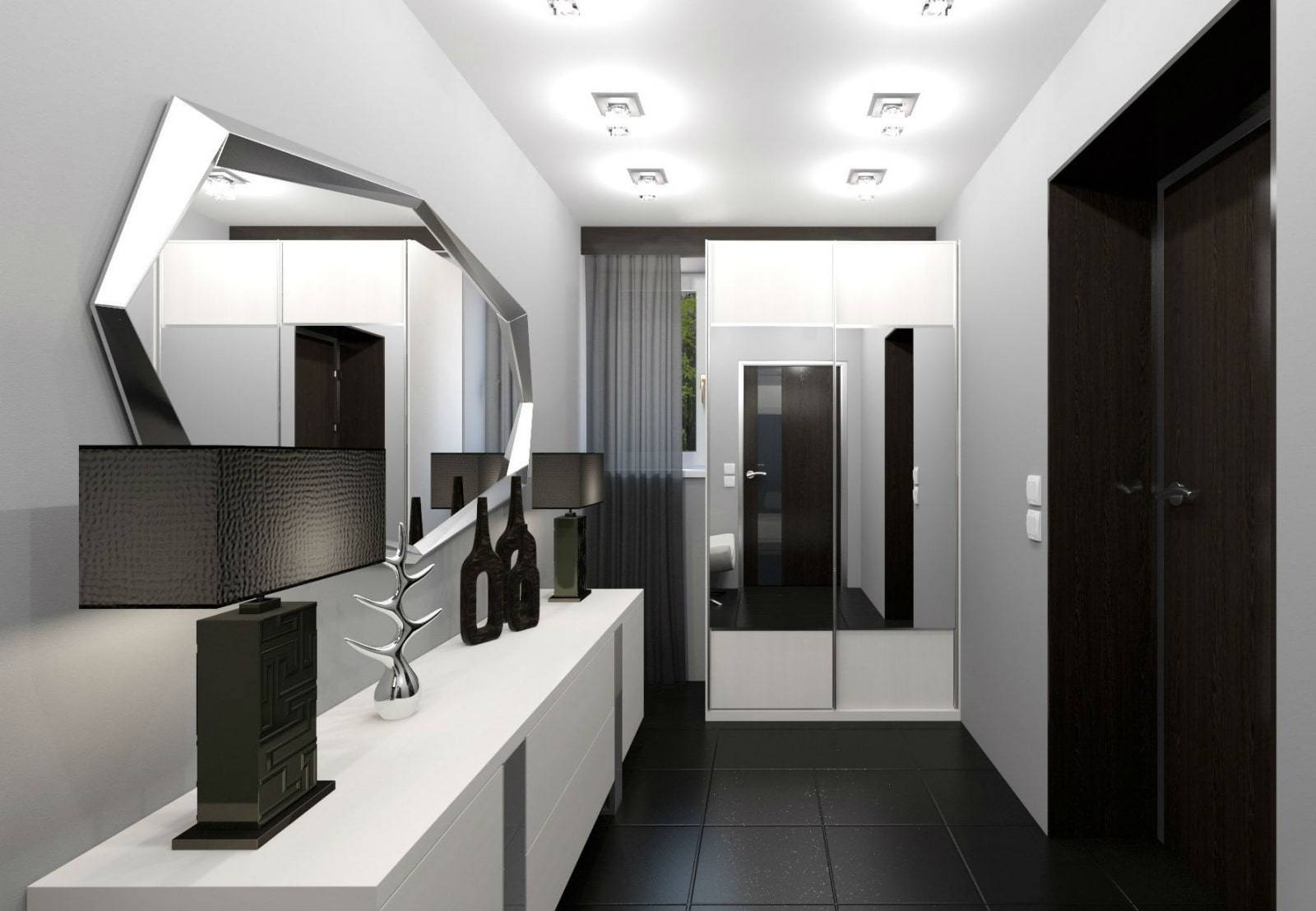 - При дизайне узких прихожих и коридоров необходимо визуально устранить недостатки геометрии помещения и продумать расположение вещей: