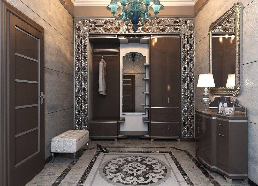 В отличие от всех предыдущих предложений, оформление интерьера прихожей в стилистике арт-деко предполагает использование только качественных и дорогих материалов. Шик и роскошь в таком варианте проявляются в каждом сантиметре комнаты, начиная от многоступенчатых потолков с элементами лепнины, заканчивая чётко выраженной фактурой стен и глянцевым покрытием на полу. Если вам приемлемо такое обустройство, то о мебели эконом варианта и прочих экономиях придётся просто забыть. Что касается выбора люстры или зеркал, то для такого оформления актуально отдать предпочтение изделиям с металлическими деталями.