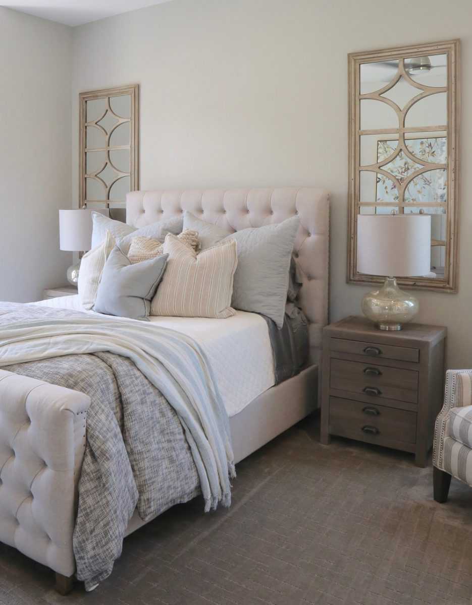 К примеру, двуспальная кровать смотрится в большой спальне более торжественно, роскошно. Лучше насытить интерьер предметами декора — именно они создают особую атмосферу, антураж в помещении. В просторной спальне красиво будет смотреться большое зеркало в художественной раме, картина или текстурная графика на стене.