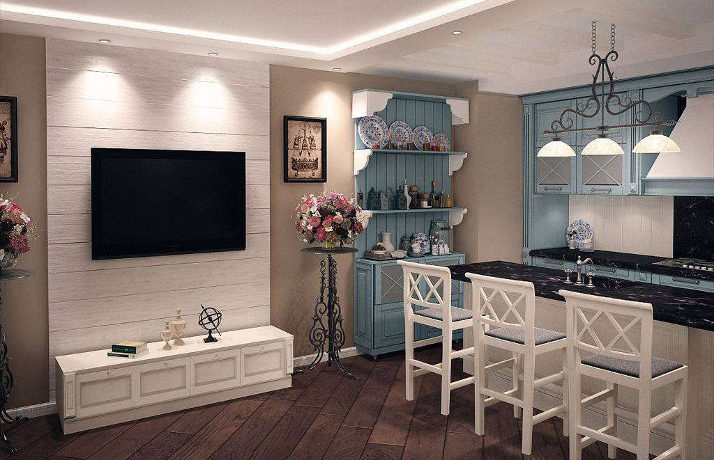Стиль прованс в кухне-гостиной с ТВ-стеной