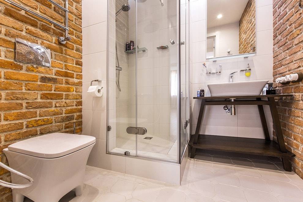 - Некоторые предпочитают использование стиля «лофт». Для него характерны места, где видна кирпичная вкладка, небрежно сделанная штукатурка и перегородки, которые состоят из стеклоблоков.