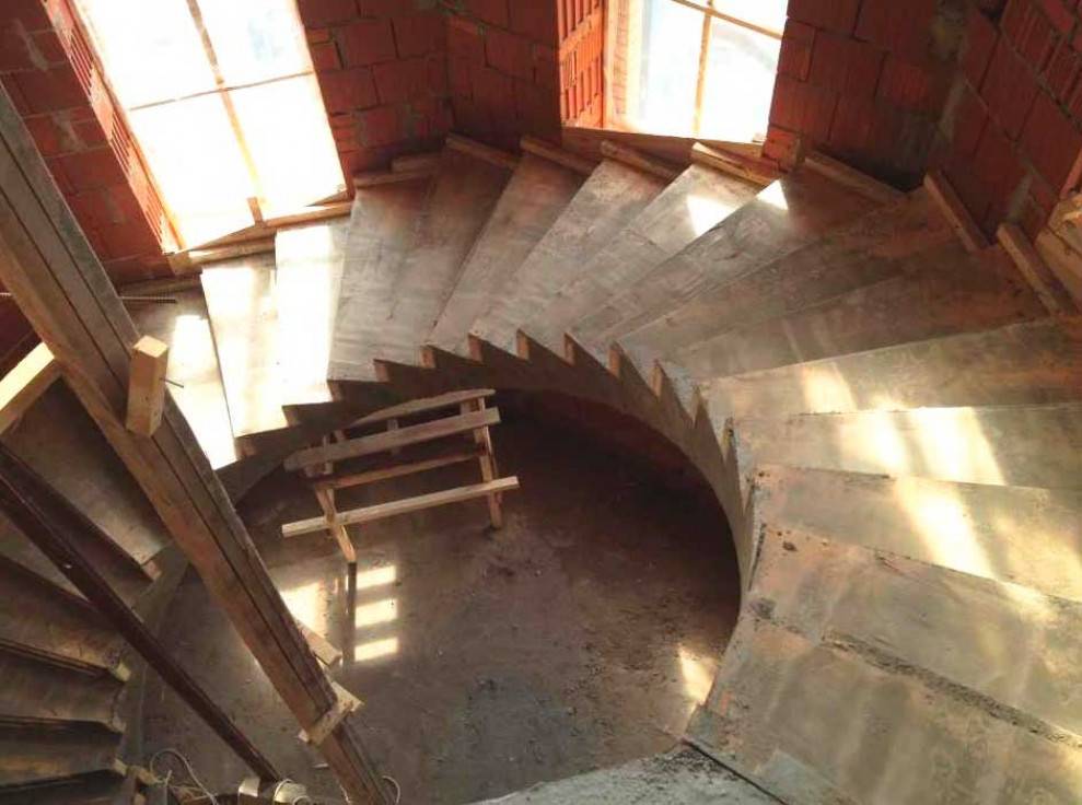 Для винтовой лестницы необходимо сделать опалубки определенной формы. Основание под бетонную смесь делается точно также как и для прямого марша. Такой вид лестницы достаточно сложный по своей форме. Из-за этого элементы для залива бетона, приходится сооружать отдельно. Готовые многоразовые опалубки не подойдут к винтообразным лестницам.