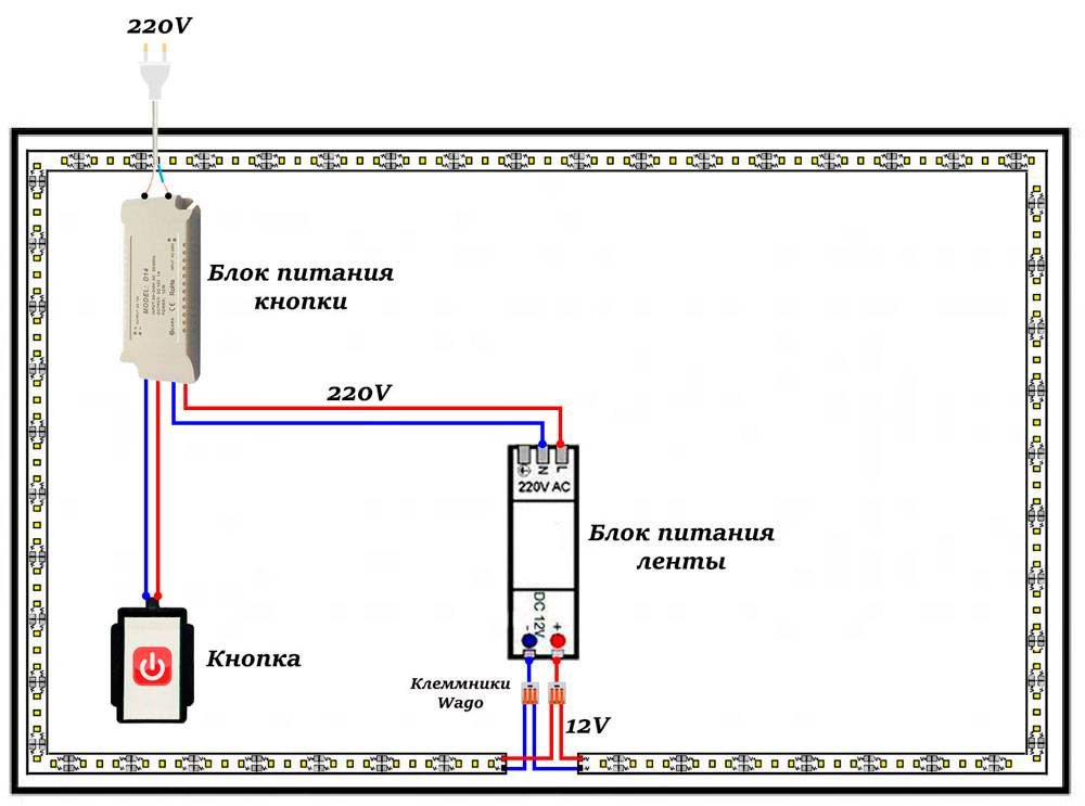 Далее провода идут на понижающий блок 220V/12V, а уже от него подключается светодиодная лента.