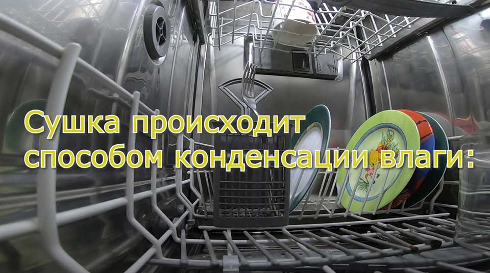 Конденсационная | Вода испаряется и стекает с внутренних стенок в поддон, после чего насос выкачивает воду. | Наиболее простой метод. Низкая цена ПММ. Нет теплового воздействия на хрупкие предметы. Бесшумность. Минимальное потребление электричества. | Длительное время сушки. Наличие разводов. |