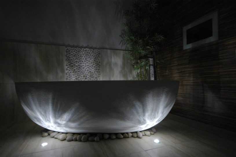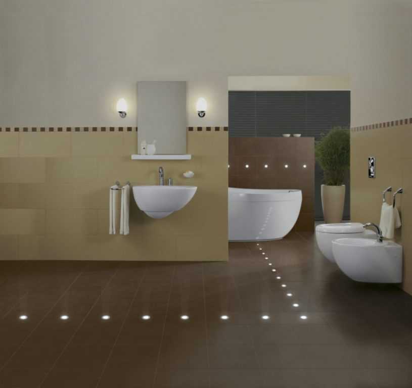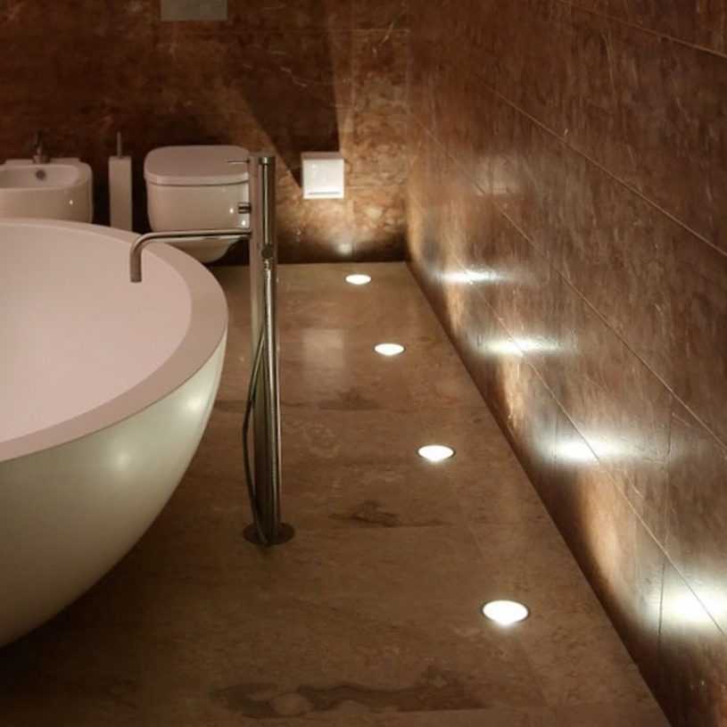 Такие лампы необходимо помещать в пол или стену и изолировать от попадания влаги. Дизайнеры же предлагают располагать такое освещение вдоль стен, подальше от кранов.