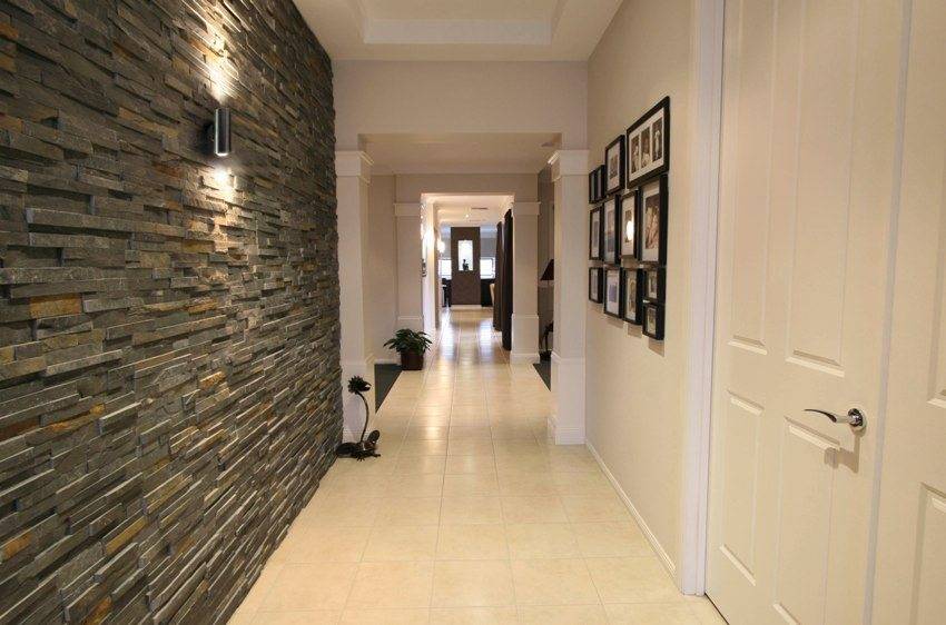 Отделка прихожей декоративным камнем и обоями. Фото законченных интерьеров