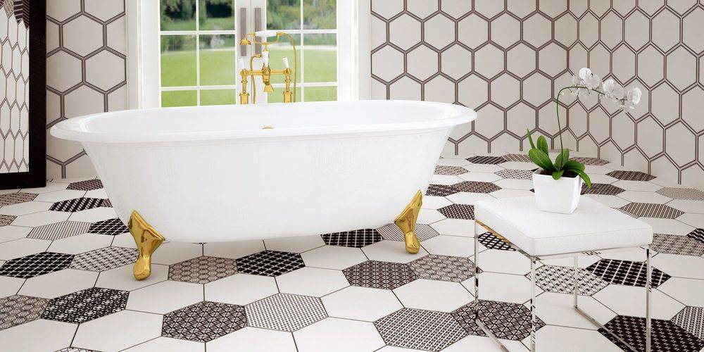 Крупная шестиугольная плитка немного напоминает оформление помещений в старину. Таким кафелем выкладывались не только стены, но и пол. В приоритете бежевый, белый и серый оттенок для данной формы кафеля. Если желаете соответствовать моде, то таким материалом нужно создавать различные орнаменты на стенах.