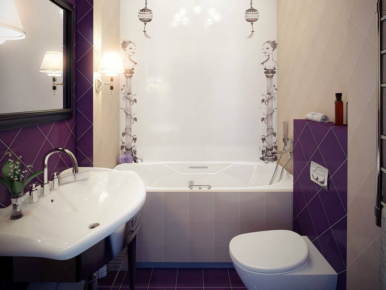 Кафель небольшого размера отлично подходит для оформления функциональных зон: за умывальником, вокруг ванной или в районе унитаза. Такая облицовка хорошо применяется для оформления стен целиком. Главная задача в таком случае — сообразить, какой необходим рисунок.