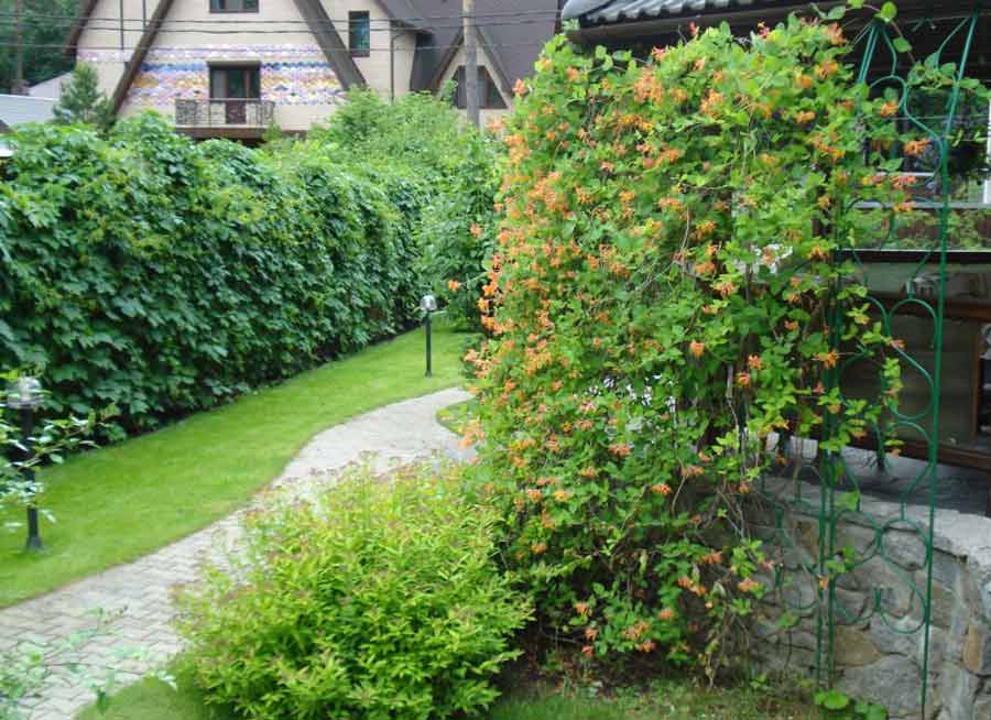 Разные виды жимолости, к примеру, Тельмана, Каприфоль – листопадные лианы, достигающие 5 метров. Они хорошо растут, дают зеленую массу и красиво цветут с мая по июль, затем появляются красно-оранжевые ягоды, что добавляет кусту декоративности. Цветы имеют приятный, насыщенный аромат.