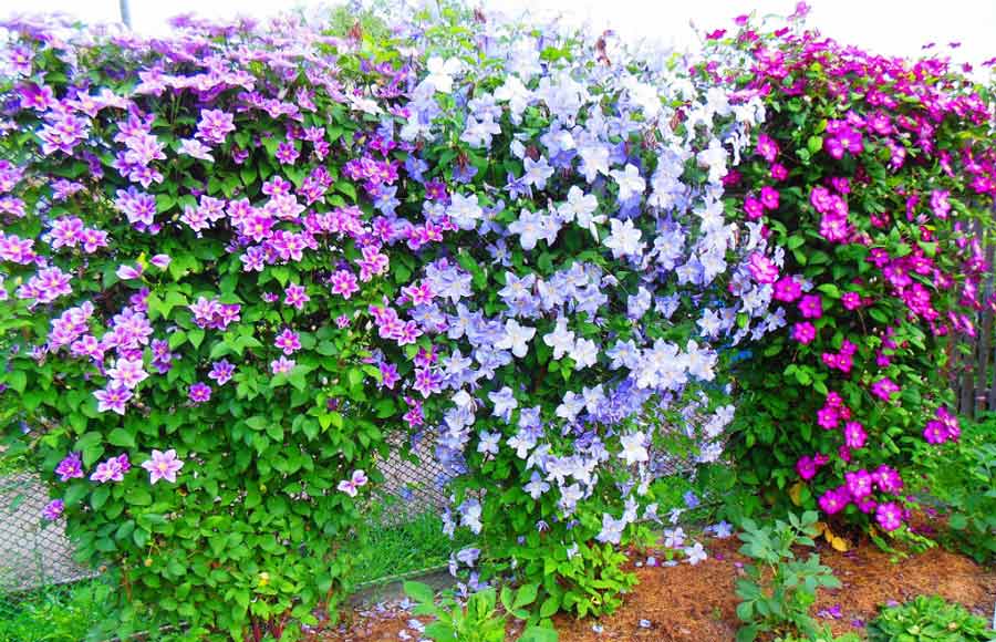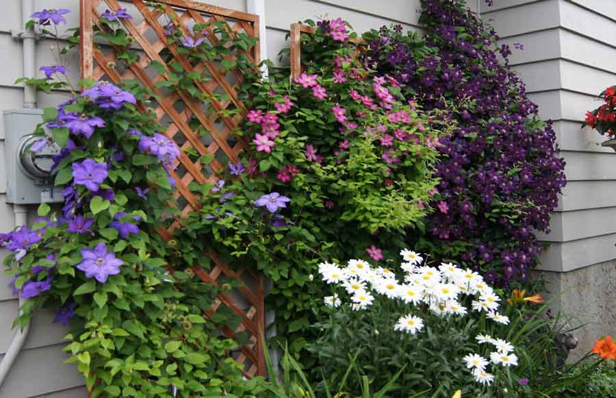Клематис – незаменимое растение для вертикального озеленения. Цветение клематисов начинается летом и заканчивается в октябре. Клематисам требуются вертикальные опоры, цепляясь за которые лианы будут расти вверх. Делая опору, необходимо учитывать, что диаметр не должен быть больше 1 см., в противном случае, листовым черешкам трудно будет обхватить ее. Красиво клематисы смотрятся на наклонных опорах.