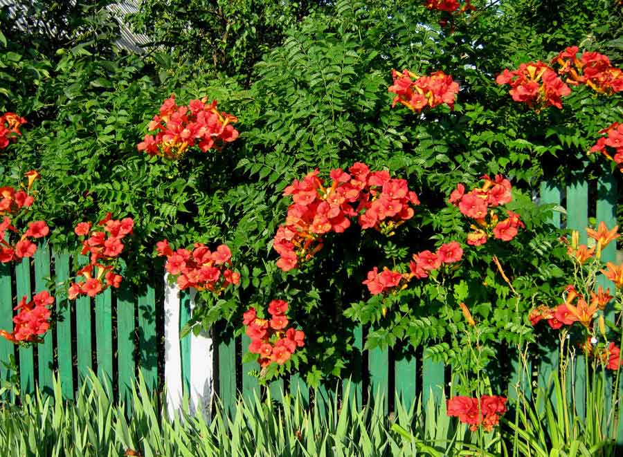 Кампсис – древовидная лиана. После зимнего периода это растение долго «просыпается», поэтому не торопитесь огорчаться, что растение погибло, оно непременно оживет при наступлении тепла. Быстрорастущее растение, поэтому требуется крепкая опора. Цветет ярко- оранжевыми крупными цветами, которые своей формой напоминают граммофоны.