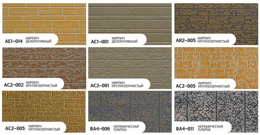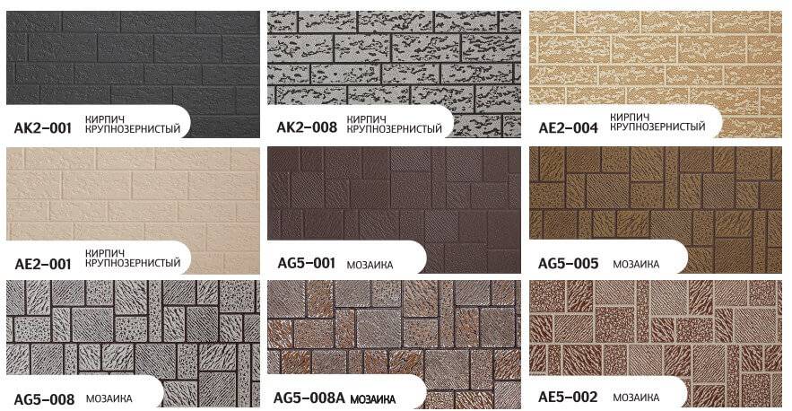 Кирпич крупнозернистый: AK2-001,AK2-008,AE2-004,AE2-001. Мозайка: AG5-001,AG5-005,AG5-008,AG5-008A,AE5-002