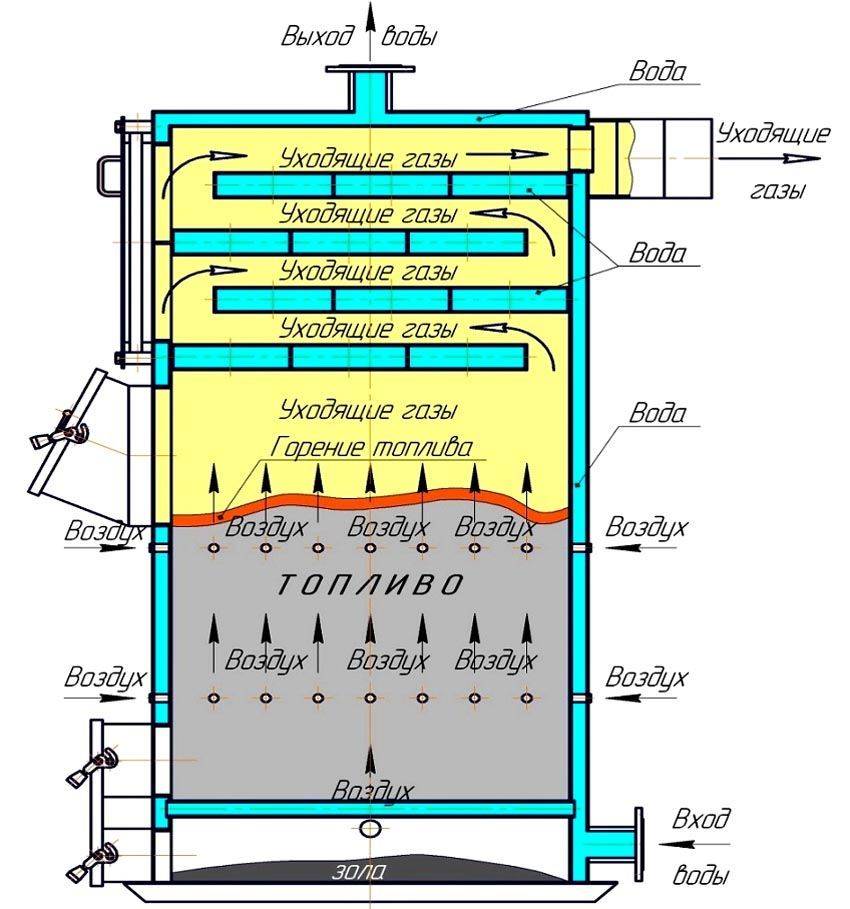 Котлы отопительные выделяются только наличием накопительного бака с водой, сформированного вокруг основной камеры, и камеры для сжигания газа. Сложность в исполнении таких котлов заключается в подборе оптимального режима работы, ведь при нагреве вода отбирает много тепла, что сбивает длительный режим горения. Фактически приходится настраивать каждый раз заслонки под различные температурные режимы.