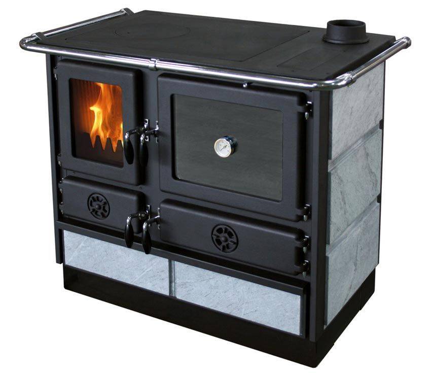 Печи с варочной панелью, а также декорированные печи для установки в жилых помещениях имеют более привычный прямоугольный или ромбовидный вид. Конструктивно никаких отличий нет. Возможно включение колосника в топочную камеру. Часто вывод дымохода выполняется вертикально без организации отдельного конденсат сборника. Конденсат стекает в верхнюю камеру и прогорает. Некоторые модели снабжаются прозрачными дверцами из закаленного стекла. Помимо эстетики это дает возможность гораздо проще настроить режим долгого горения, наблюдая за процессом в топке.
