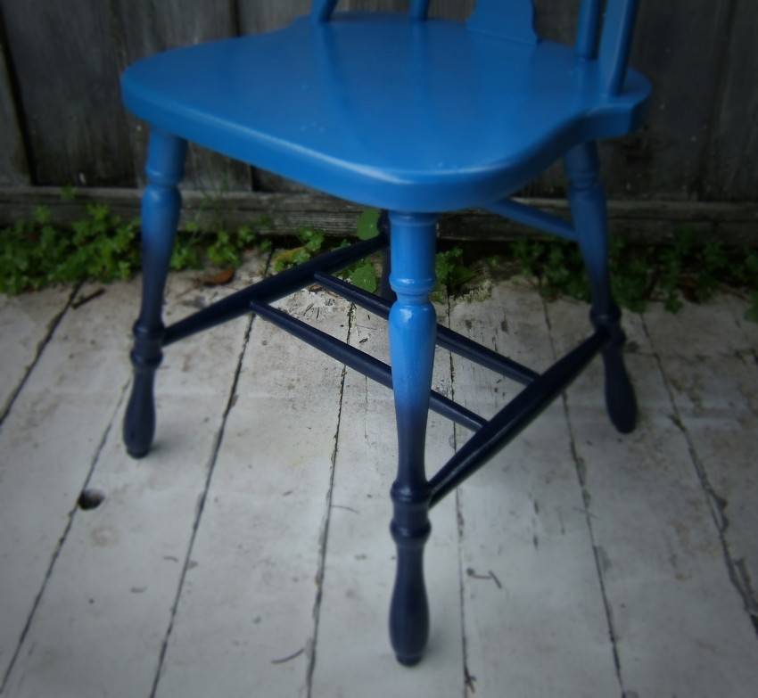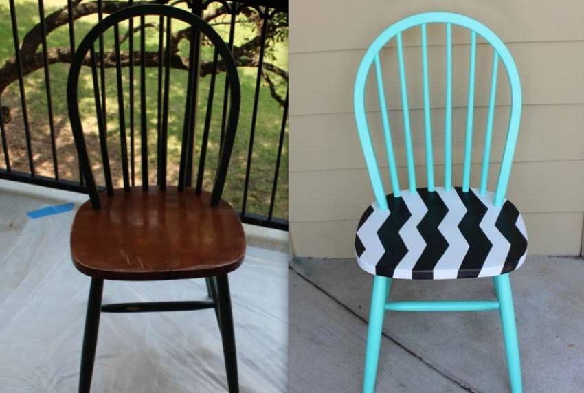 Следующий этап – это нанесение грунтовки. Для лучшего покрытия используйте валик. После этого поверхность должна высохнуть. Ножки лучше всего обмотать скотчем, затем нанести разную по оттенкам, или цветам краску. В результате вы получите обновленную, полосатую мебель.