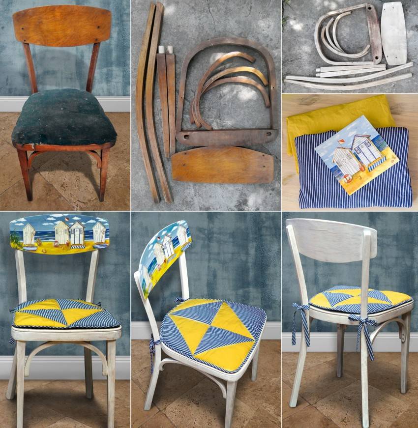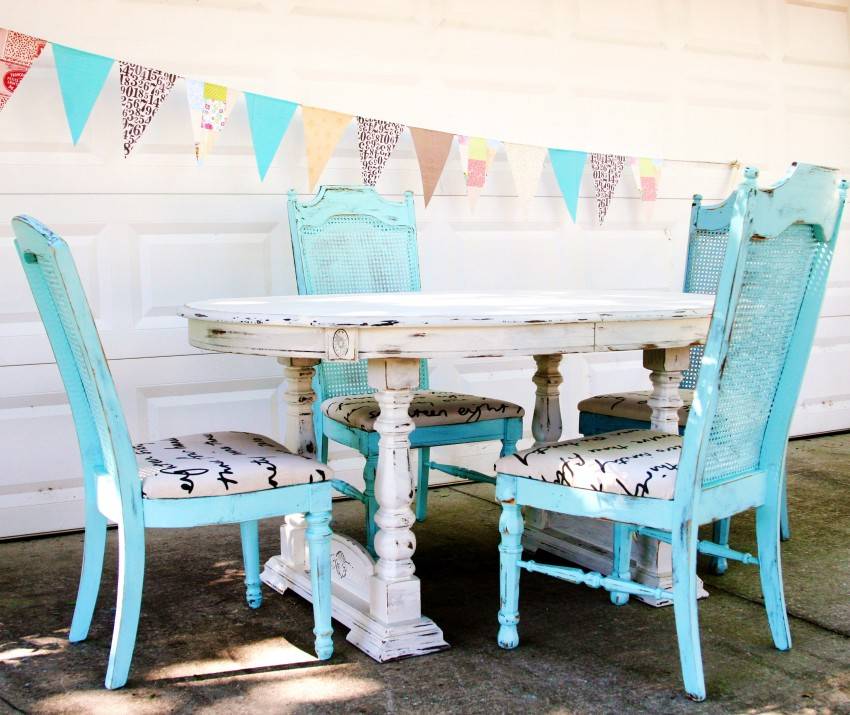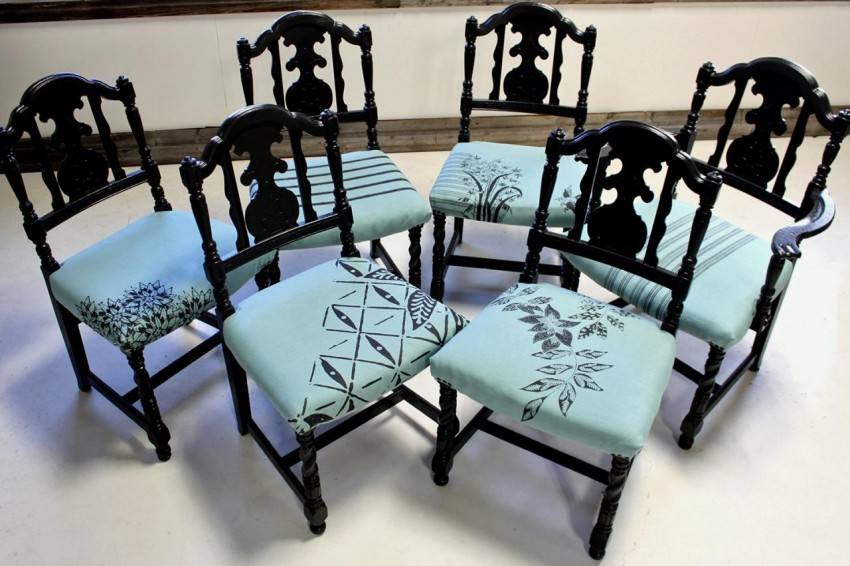 Интересный вариант – разноцветные стулья. Если у вас есть маленькие детки, этот вариант им будет точно по душе. Также применяют технику пэчворк. Стулья расписывают оригинальными картинками, рисуют, проявляя все свое творчество и фантазию.