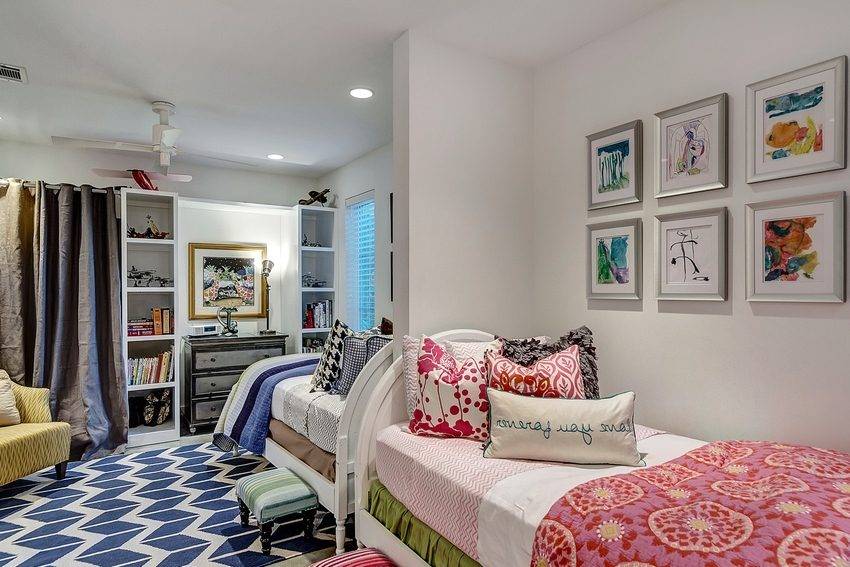 В детской комнате, в которой проживают двое детей, разделение комнаты шкафом позволяет обеспечить индивидуальное пространство каждому ребенку.