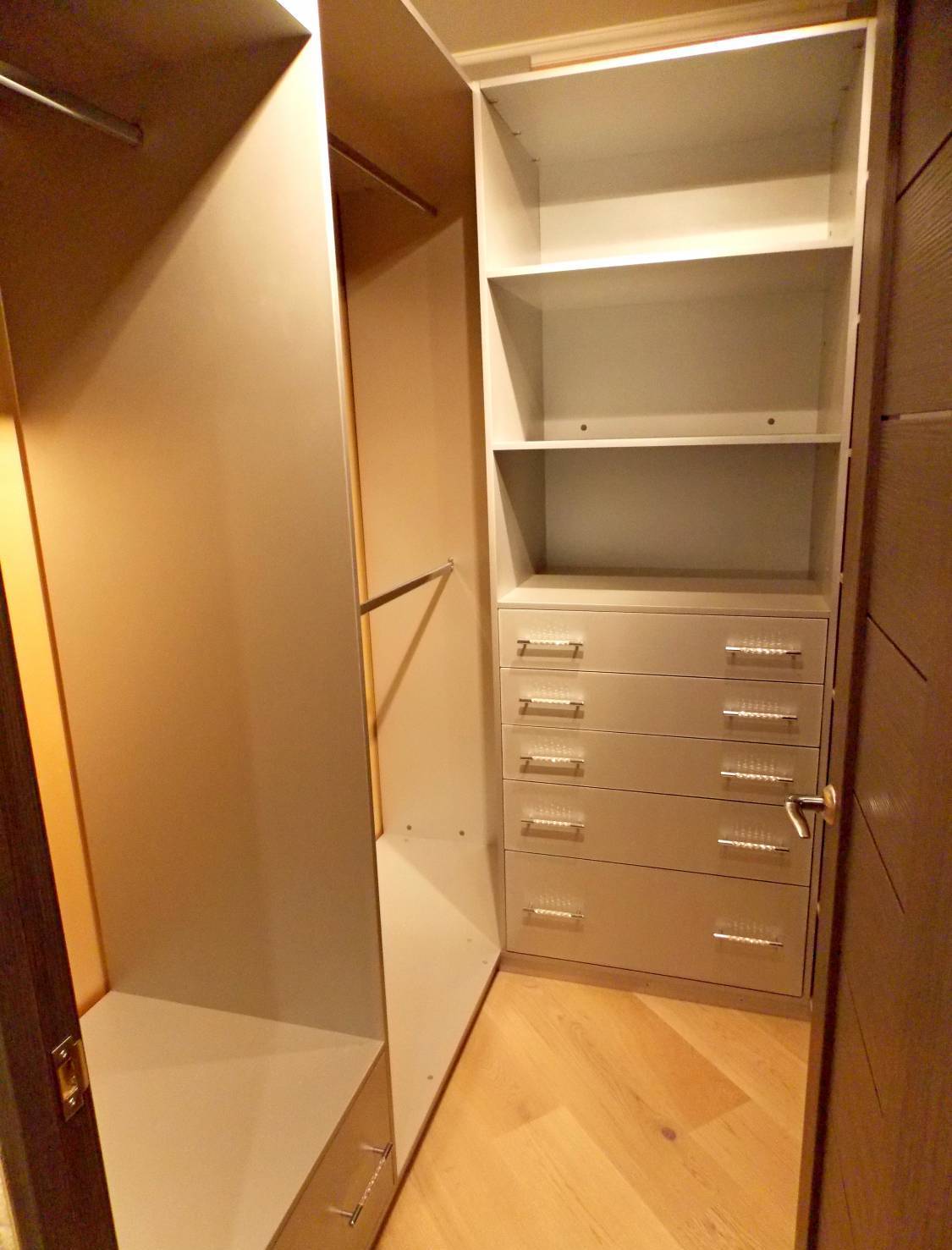 - Отводится территория спальной и закрывается гипсокартонным листом, таким образом, разделяя помещение на две части. Заранее проводится освещение и вентиляция. После устанавливаются стеллажи, штанги и ящики по вкусу владельца квартиры.