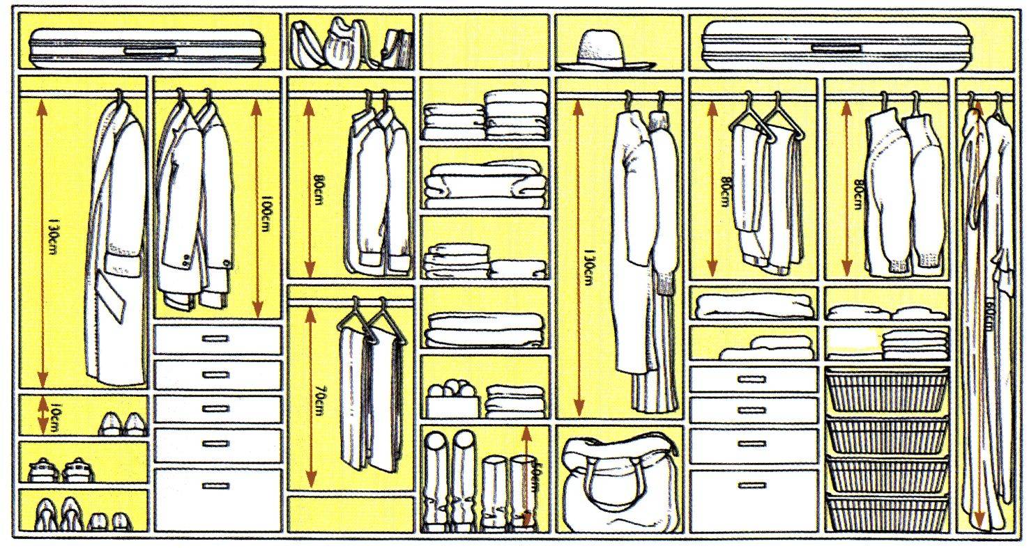 При планировании гардеробной комнаты учитывайте также правила зонирования (размещены в конце статьи).