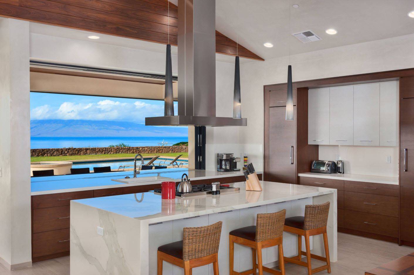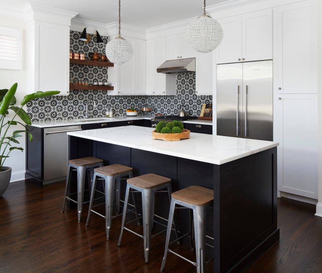 Островная планировка является оптимальным вариантом для кухонь площадью 16 кв. метров и более, часто объединенных со столовыми. В качестве острова выступает рабочая зона или обеденный стол, вынесенный в центр кухни.