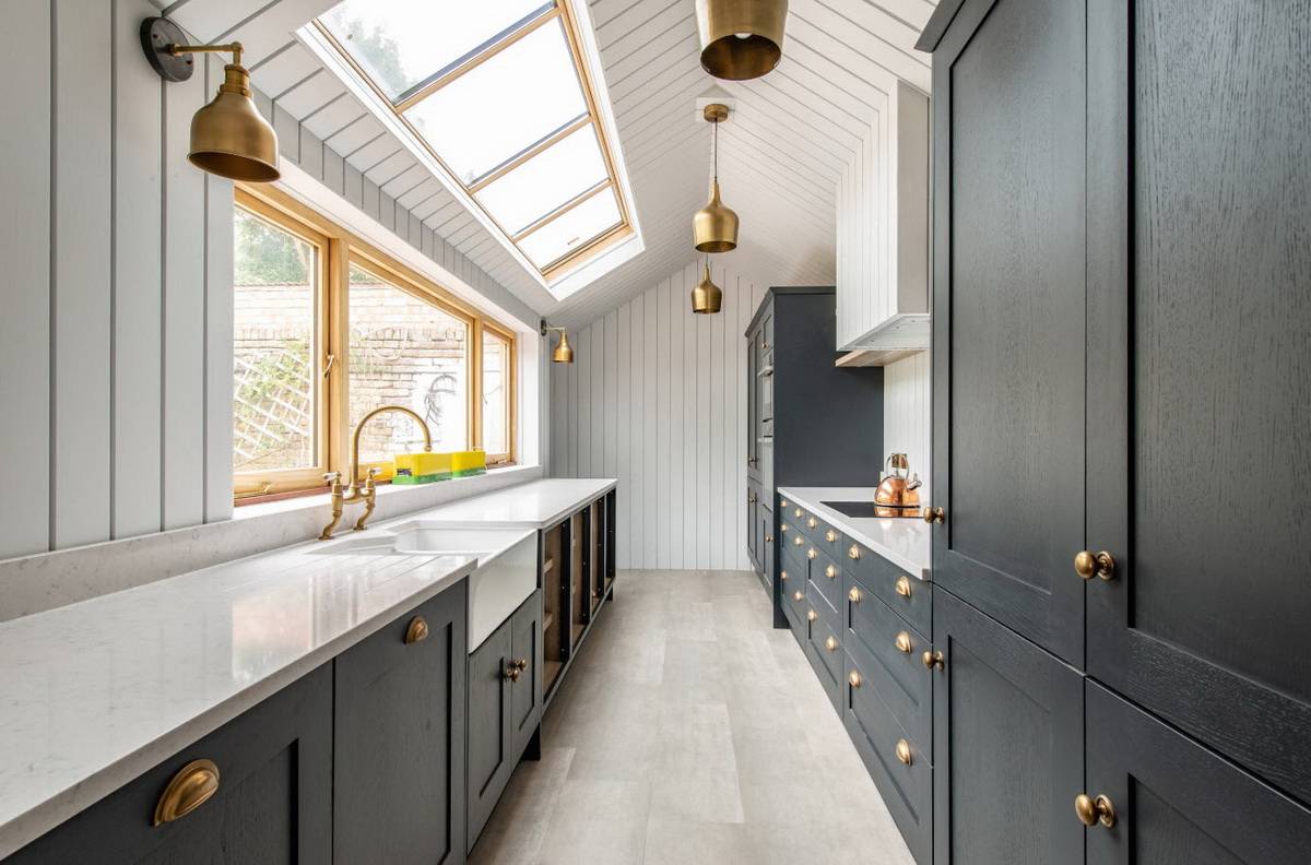 Такой вариант выбирают те, кому недостаточно в помещении свободного пространства. Линейный гарнитур может совмещаться с островом или обеденной зоной.
