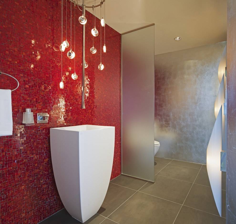 Красоту глянцевой плитки в интерьере можно подчеркнуть с помощью оригинальных световых решений