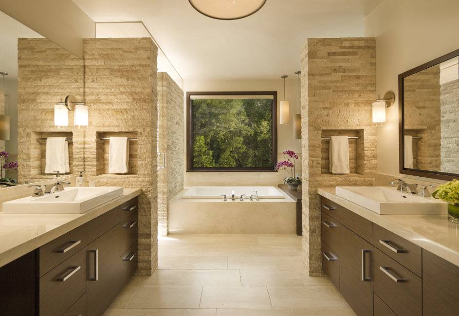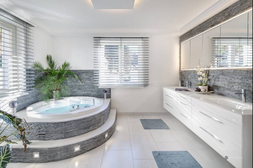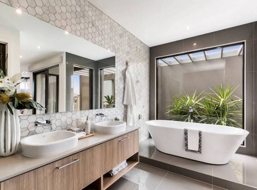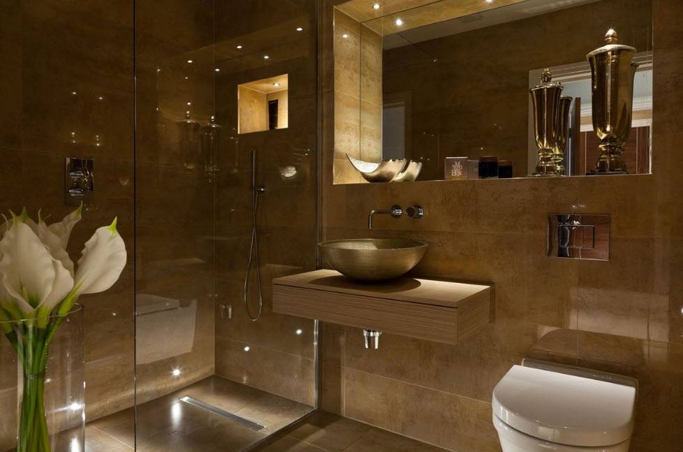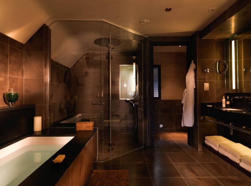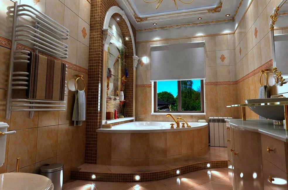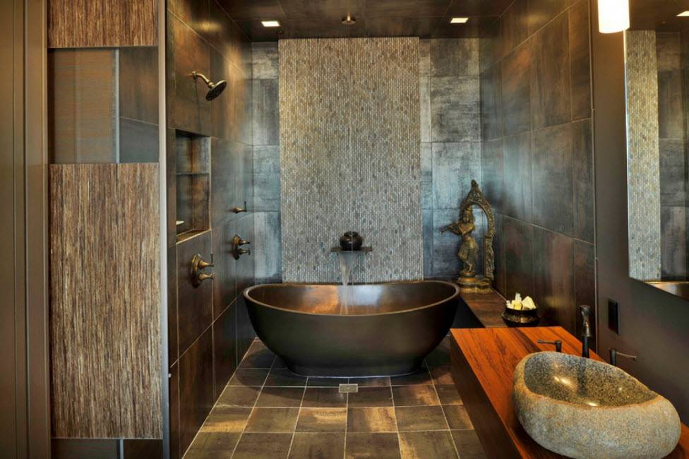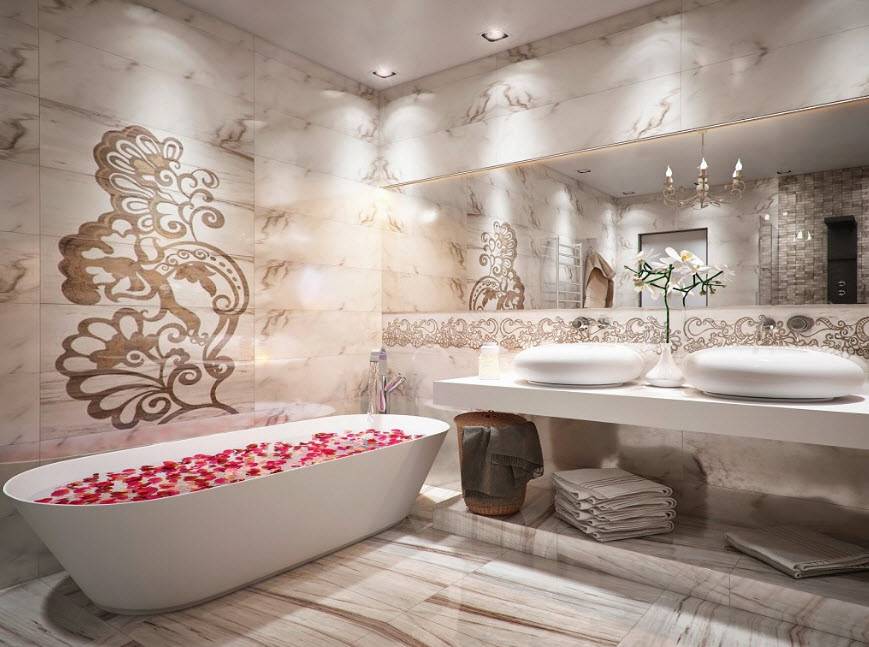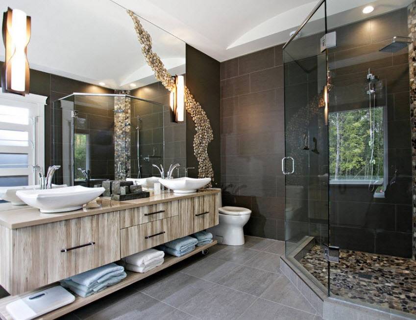 - игра цветовых сочетаний в монохромной гамме – элементами потемнее выкладываются нижние поверхности, плиткой посветлее оформляются верхние фрагменты стен;