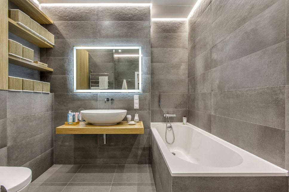 Несомненно, самым модным и востребованным в 2020 году станет серый цвет. Многие считают, что такой интерьер будет скучным, но благодаря богатству фактур и оттенков можно создать роскошную атмосферу, очаровывающую своей красотой. Для отделки лучше всего использовать каменную плитку, так как сейчас делается ставка на натуральность. Создать гармоничную атмосферу можно, выбирая плитку, дублирующую фактуру мебели (глянцевые фасады и глянцевая плитка или же деревянная мебель и матовая отделка, повторяющая фактуру древесины).
