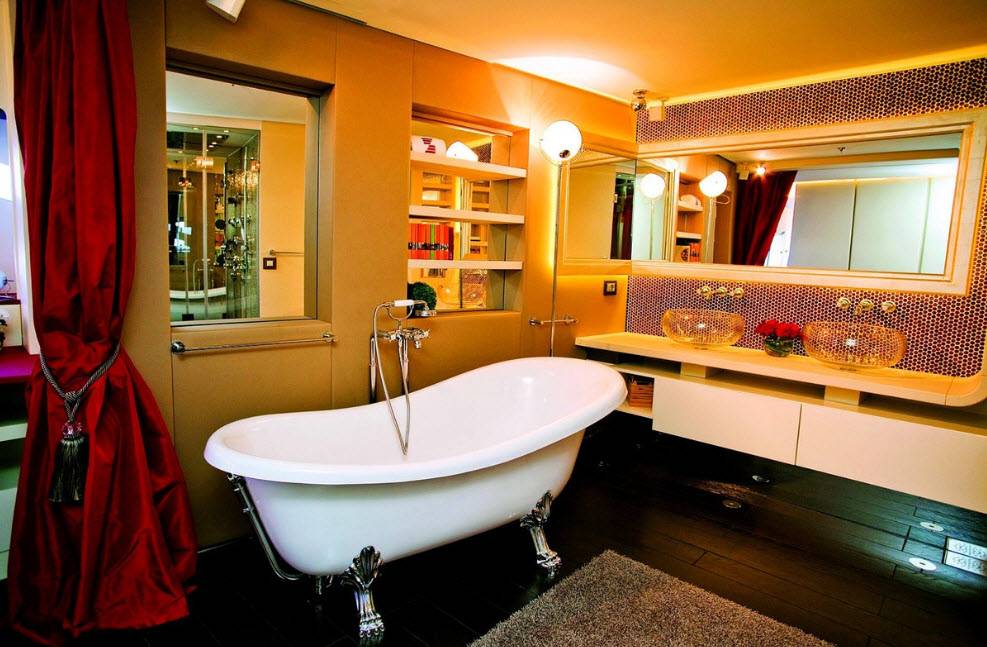 - Сделав контрастный пол и стены, можно создать необычное дизайнерское решение в самой будничной и стандартной ванной.