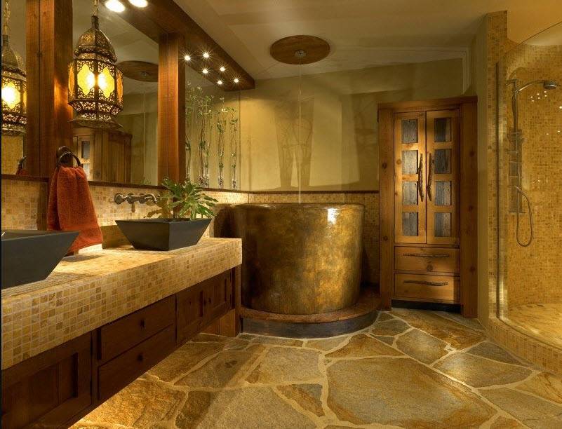 Каменная мозаика для ванной – дорогой отделочный материал, который популярен у владельцев загородных домов. Завидная влагостойкость данного вида отделки и почти бесконечный срок службы обусловили широкое применение облицовки на стеновых панелях помещений с повышенной влажностью