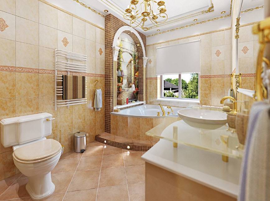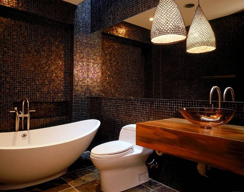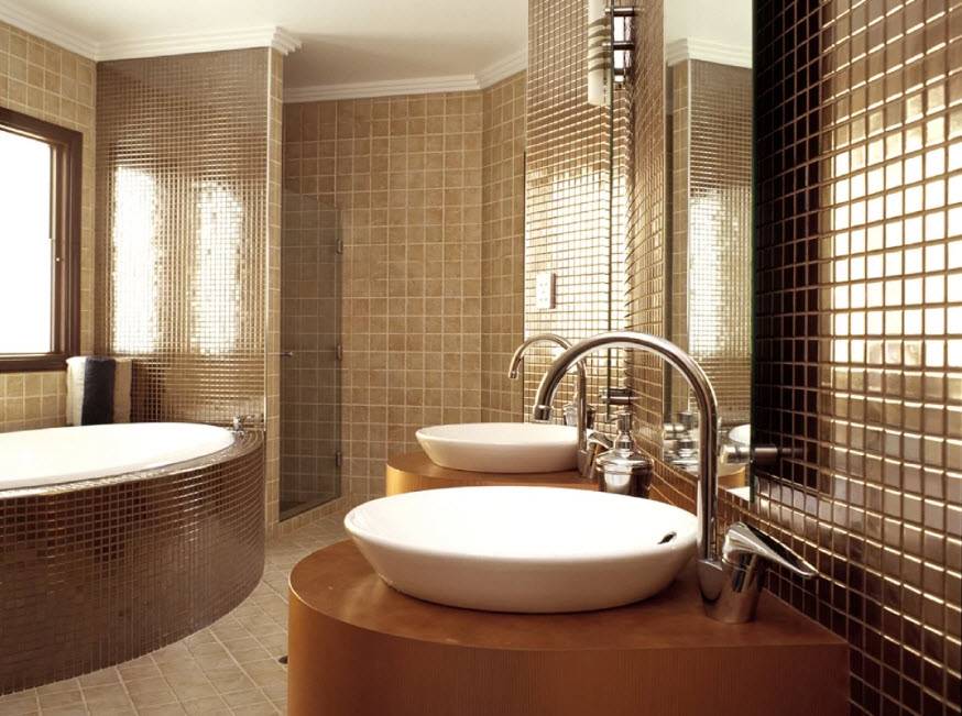 - Мелкая мозаика отлично выглядит в любой ванной, но стоит не забывать, что уход за ней несколько сложнее.