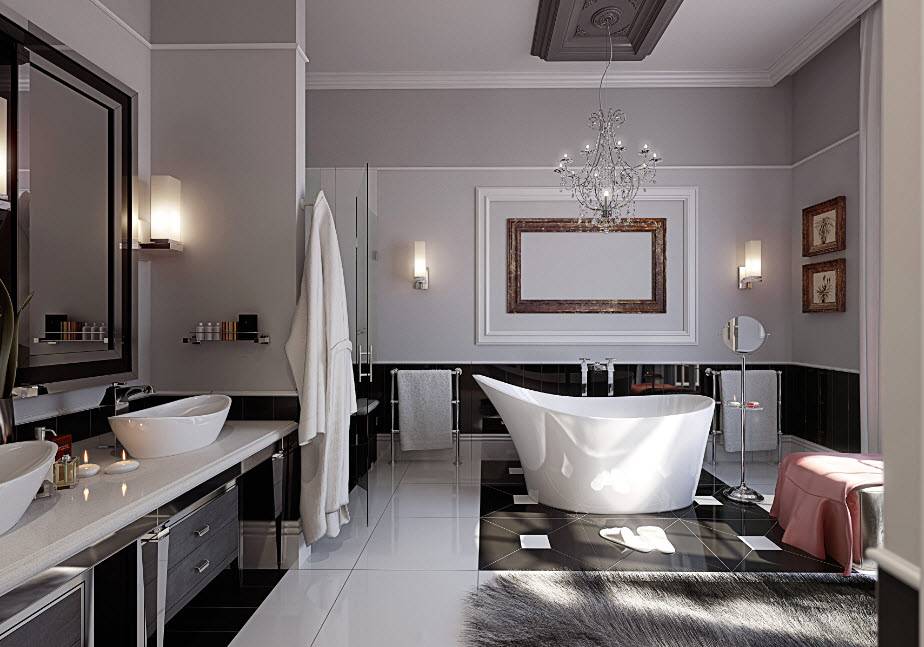 - Черно-белое сочетание стоит выбирать для средних и больших ванных – это сделает их гармоничными и целостными.