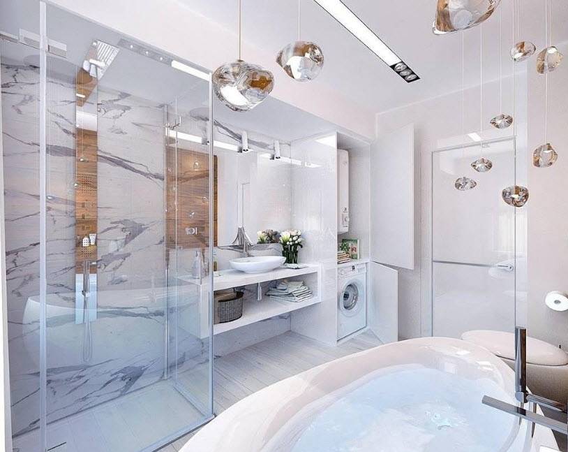 Небольшой совместный санузел будет казаться шире за счет белоснежных глянцевых стен, мебели и наличия зеркал