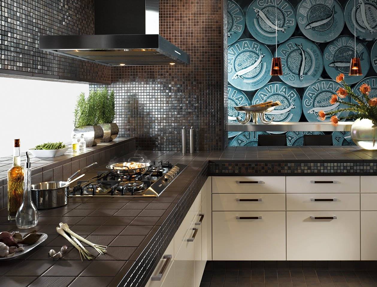 Ограниченные размеры кафельной плитки для кухни налагают определенные стереотипные рамки для ее использования. Мозаичные панно, благодаря разнообразной величине отдельных элементов, легко компонуются со всевозможными материалами, позволяя достигнуть весьма необычных эффектов.
