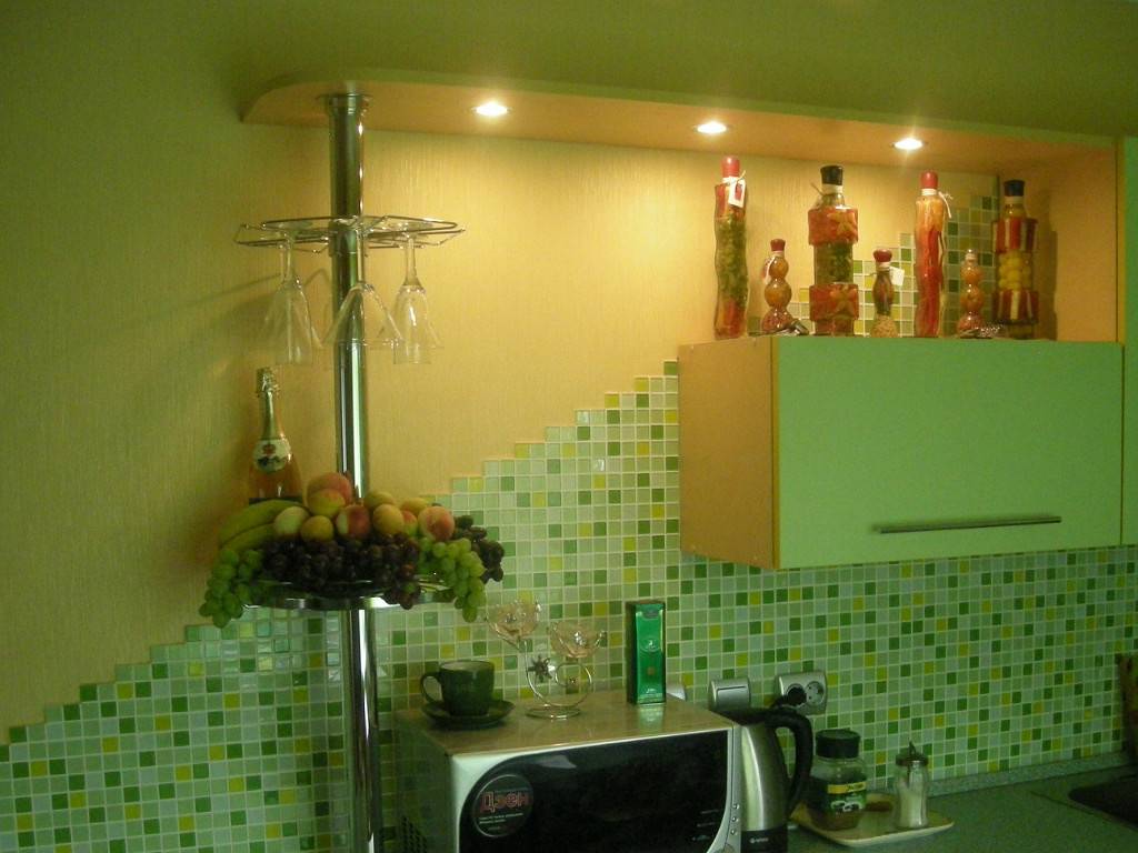 Например, разумно украсить стену над зоной готовки панно с изображением кофейных зерен или чайных листьев, разбросанных в хаотичном порядке, а над обеденным столом разместить картину из мозаики, иллюстрирующей сервировку стола во время кофе- или чаепития.